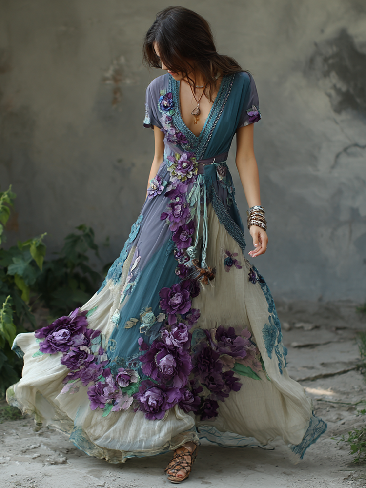 Vintage Gradient Purple Rose And Floral Embroidery Linen Short Sleeve Dress