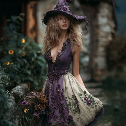 Vintage Purple Floral Contrast Patchwork Flowy Linen Dress