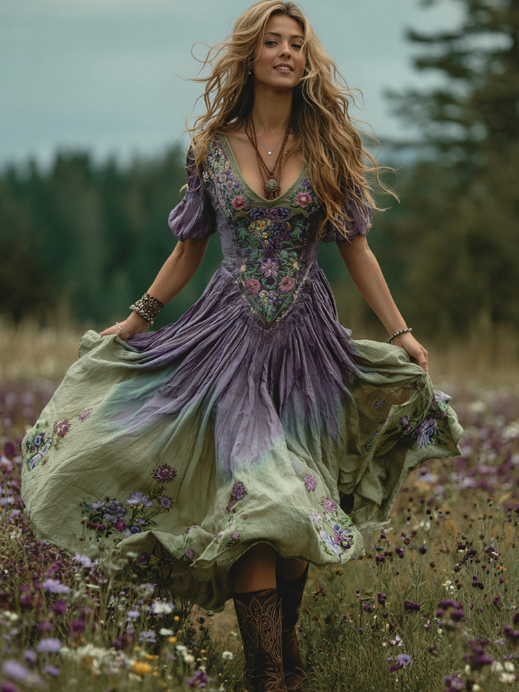 Vintage Purple Floral Embroidery Gradient Art Linen Short Sleeve Dress