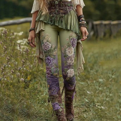 Vintage Purple Lavender And Floral Embroidered Casual Leggings