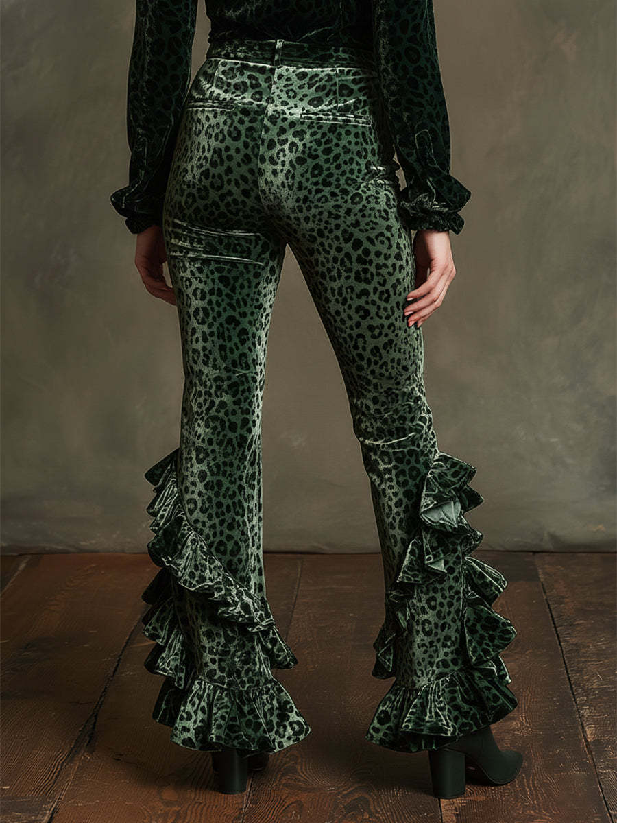 Vintage-style Ruffled Emerald Leopard Print Skinny Stretch Velvet Pants