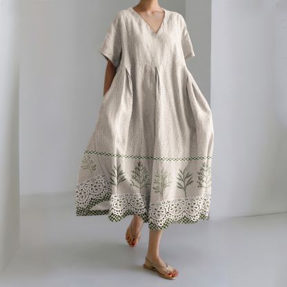 Vintage Tree Embroidery Plaid Lace Linen Blend V-neck Dress