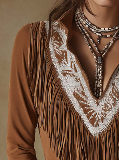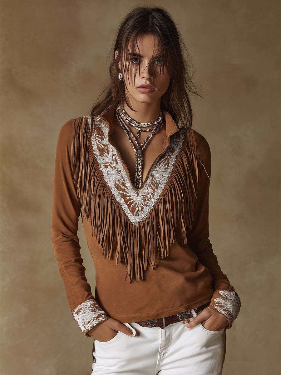 Vintage Western Style Exquisite Embroidered Tassel Brown Faux Suede Shirt