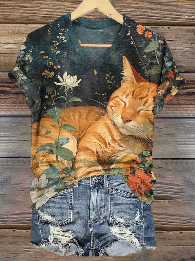Vintage Wild Floral Cat Print V Neck Short Sleeve T-Shirt