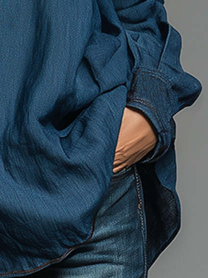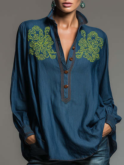 The Western retro embroidered blue denim shirt is a striking piece that captures the essence of frontier-inspired fashion with a touch of artisanal craftsmanship. Made from a quality denim fabric, the shirt features a deep blue wash that serves as the perfect canvas for its intricate embroidery. Embellished with classic Western motifs such as floral or paisley patterns, the embroidery is often found on the yoke, shoulders, and cuffs, adding a rich layer of texture and detail to the garment. The shirt's snap-button closures, pointed collar, and pearl-like buttons enhance its authentic Western aesthetic, while the tailored cut provides a flattering and comfortable fit.