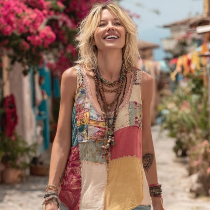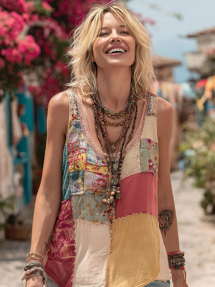 Women Vintage Floral Geometry Art Linen V Neck Tank Top