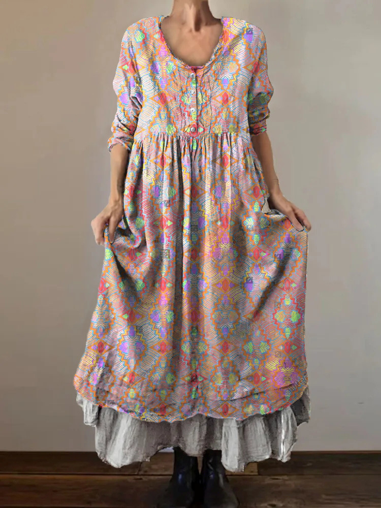 Women's Art Floral Hippie Vintage Print V Neck Dress
