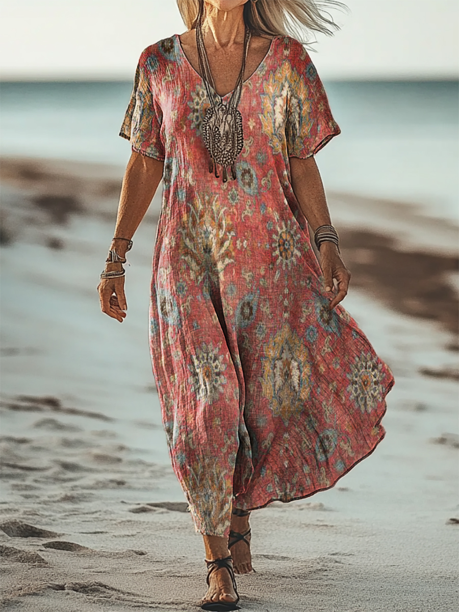 Women's Boho Ethnic Totem Art Pattern Print Short Sleeve Pocket Cotton Linen Dress