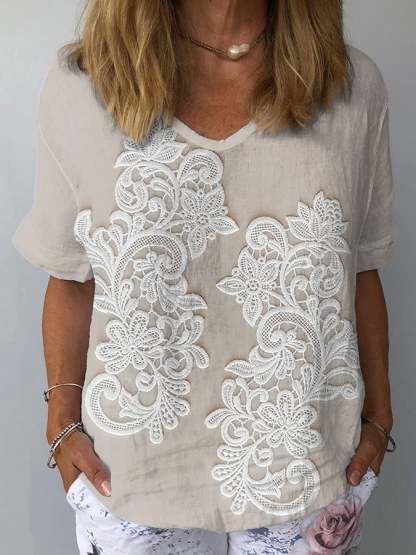 Women's Casual Floral Embroidery Print Cotton and Linen T-Shirt