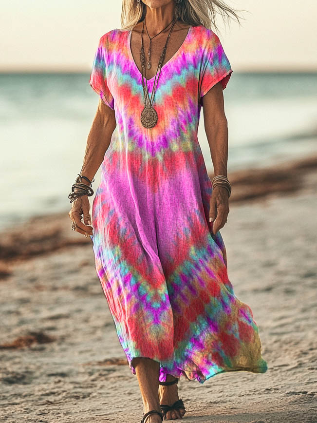 Women's Colorful Tie Dye Print Pocket Cotton Dress