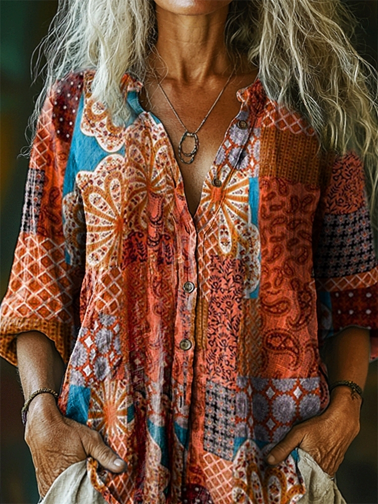 Women's Ethnic Style Tattoo Pattern Art Print Linen Cotton Casual Shirt