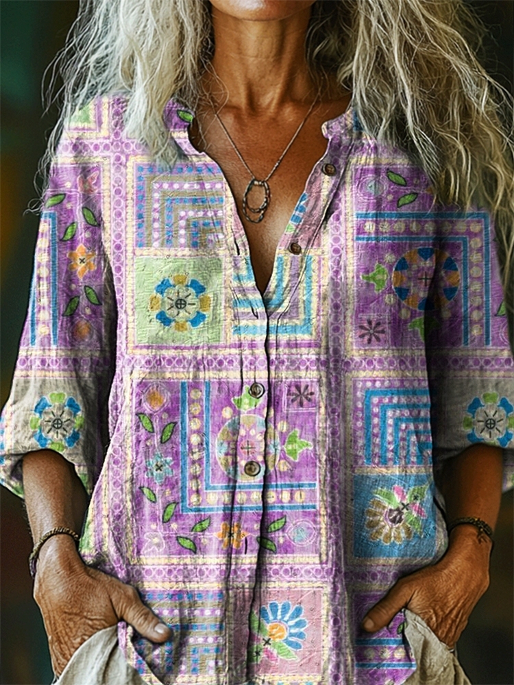 Women's Ethnic Tattoo Patchwork Pattern Art Print Linen Cotton Casual Shirt
