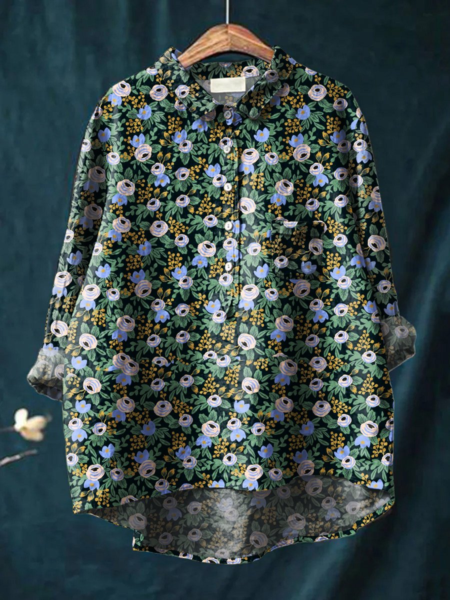 Women's Floral Art Print Casual Cotton And Linen Shirt