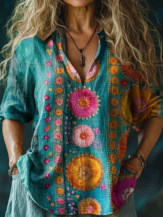 Women's Floral Art Print Casual Linen V Neck Shirt