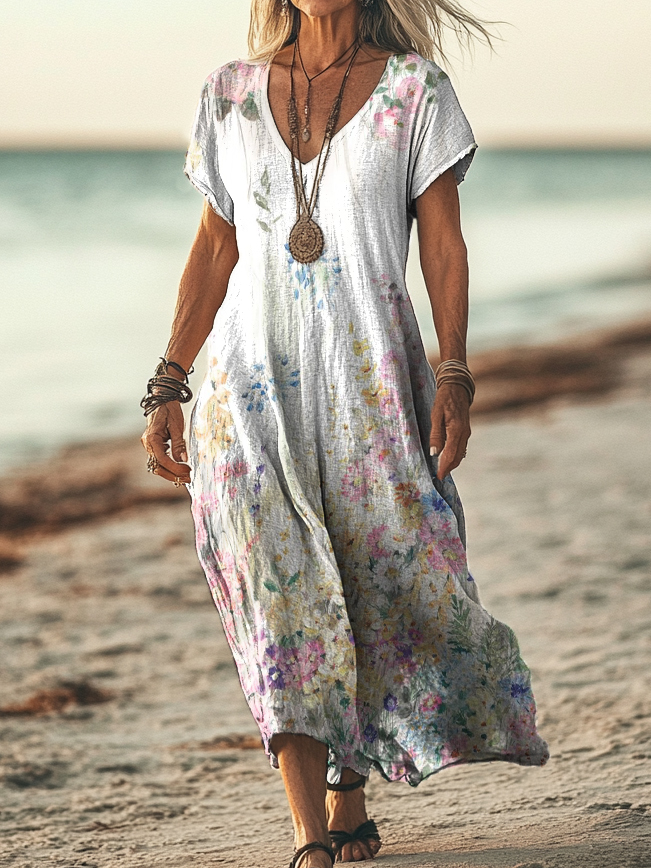 Women's Floral Pattern Printed Short Sleeve Pocket Cotton Linen Dress