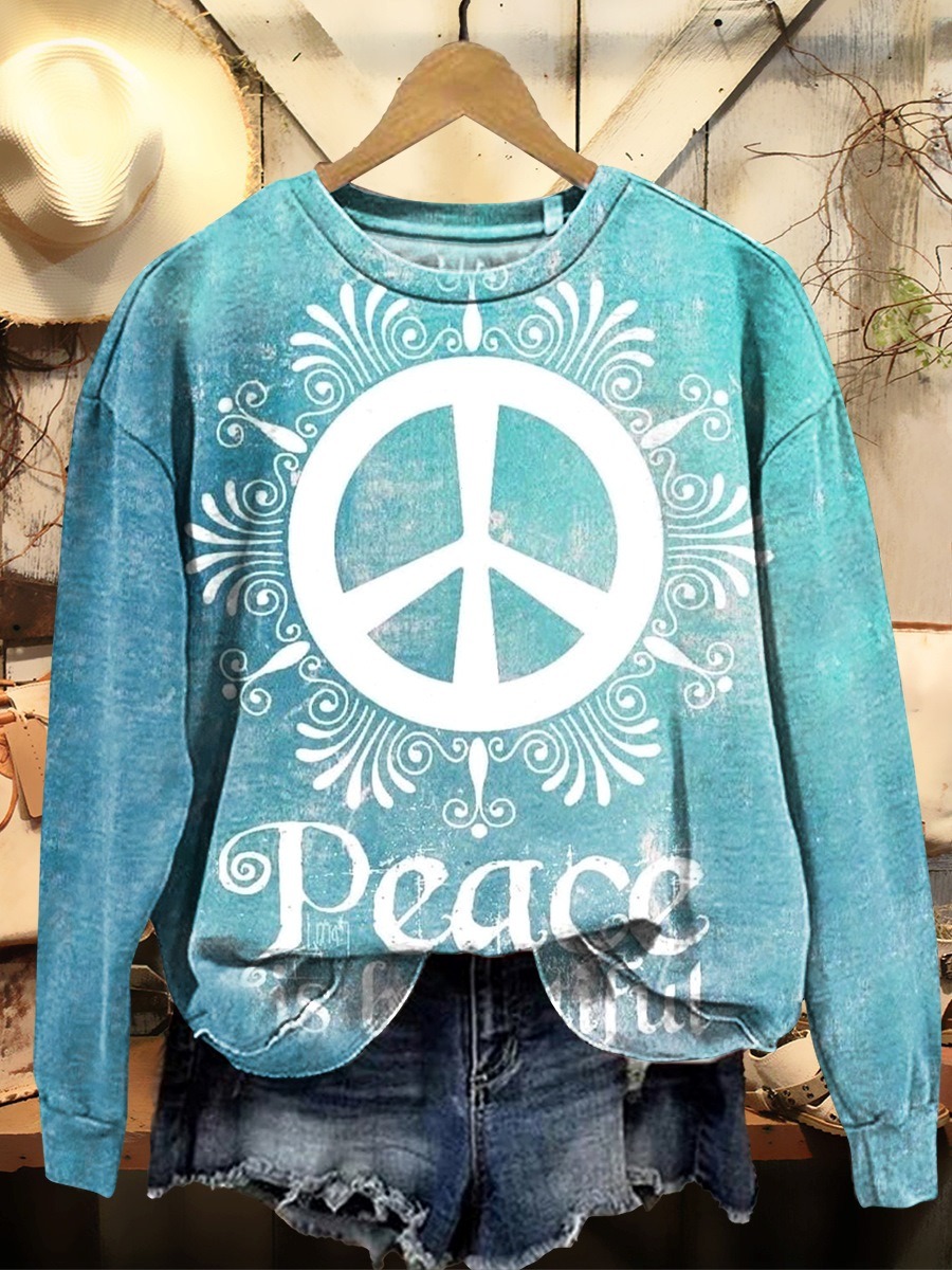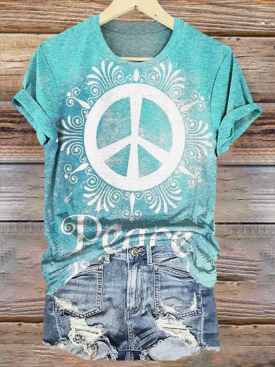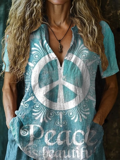 Women's Hippie Peace Is Beautiful Print Short Sleeve Pocket Cotton Linen Dress