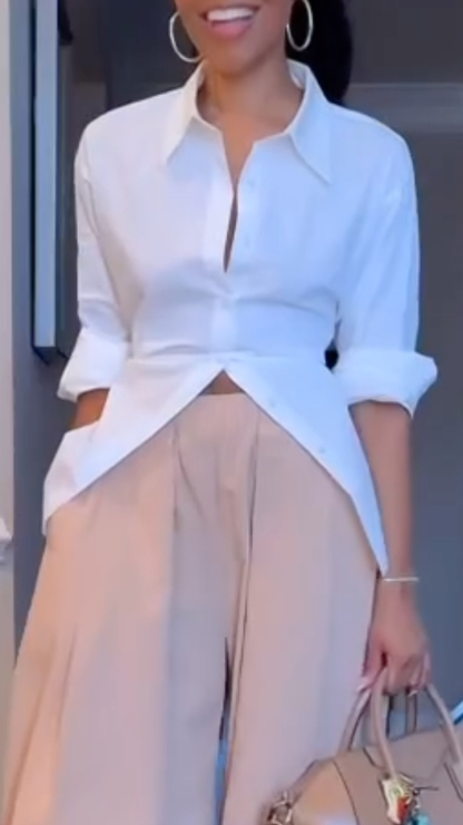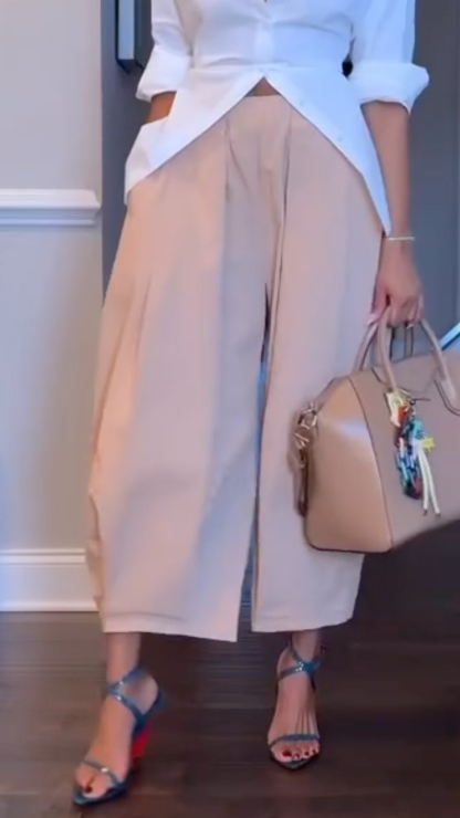 2. Design Details: Top: A long-sleeved white collared shirt featuring a cinched waist with a twisted knot design; the hem features an asymmetrical split—shorter in the front and longer in the back—to accentuate the waistline. Bottoms: High-waisted, wide-leg cropped trousers (three-quarter length) with front pleats, offering a loose, fluid drape.