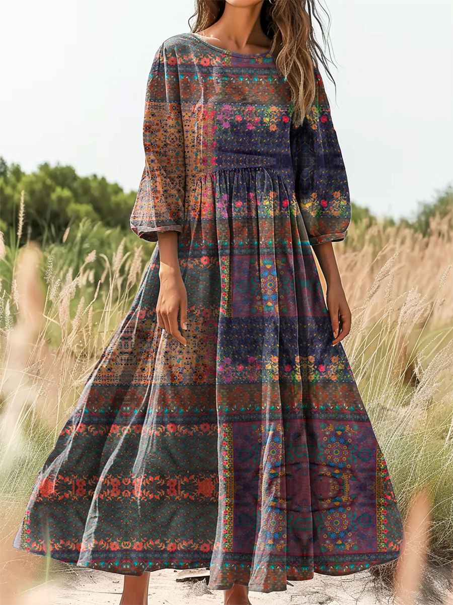Women's Patchwork Floral Art Print Cotton Round Neck Dress