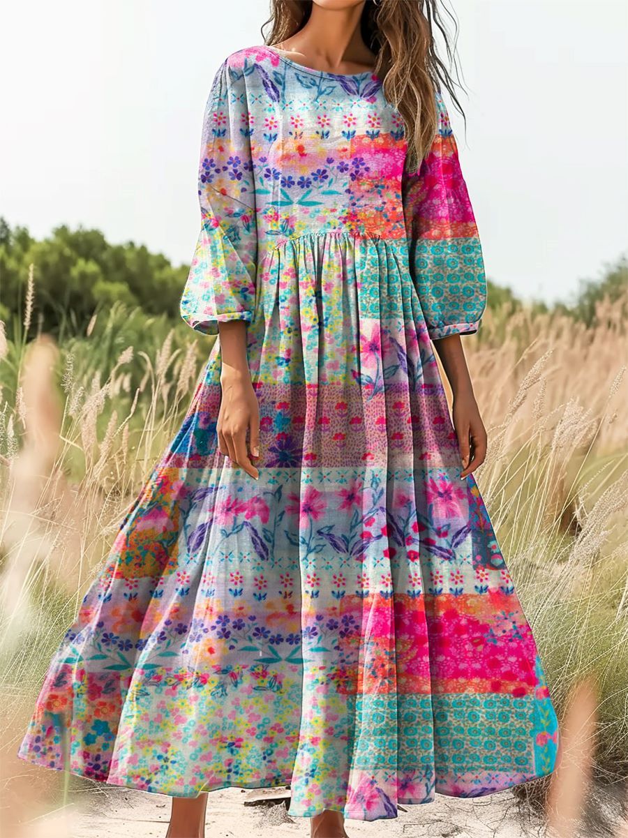 Women's Patchwork Floral Art Print Cotton Round Neck Dress
