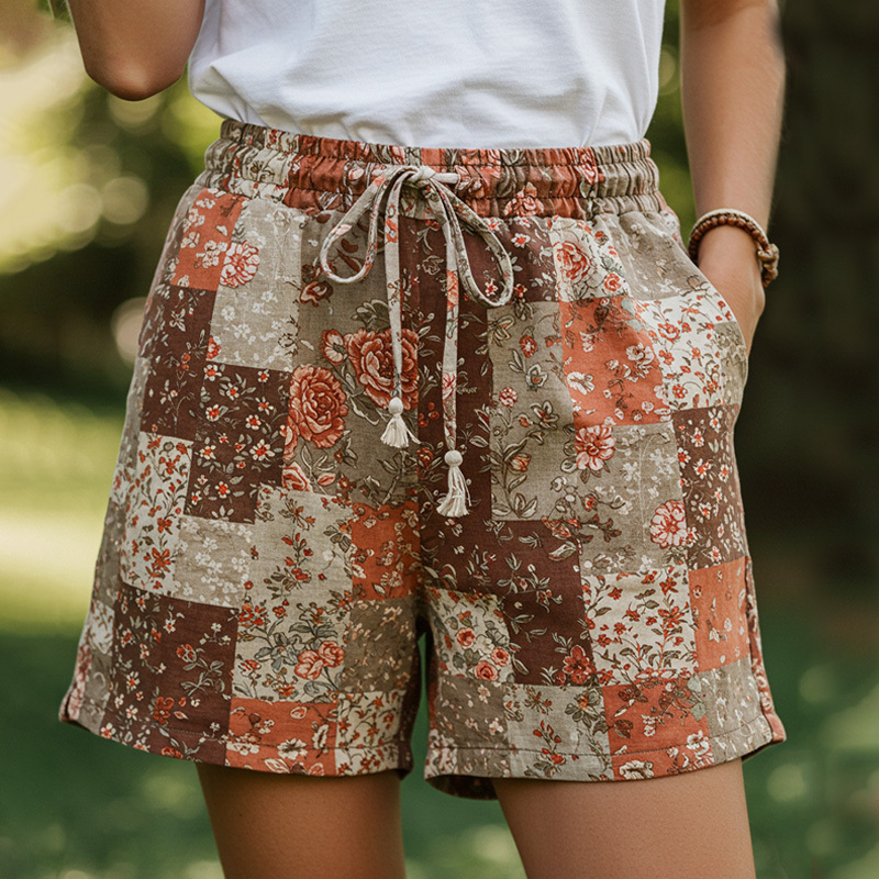 Women's Patchwork Floral Contrast Waist Drawstring Pocket Shorts