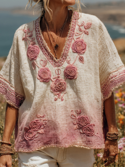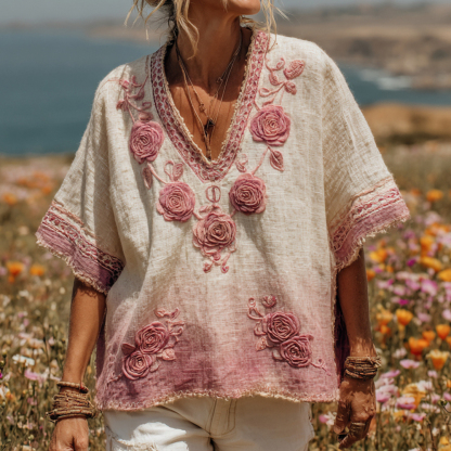 Women's Pink Rose Embroidery Print V-neck Linen Blend Loose T-shirt