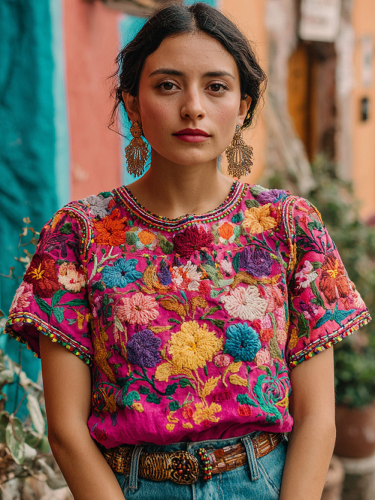 Women's Retro Ethnic Pink Awareness Flower Embroidery Printed T-shirt