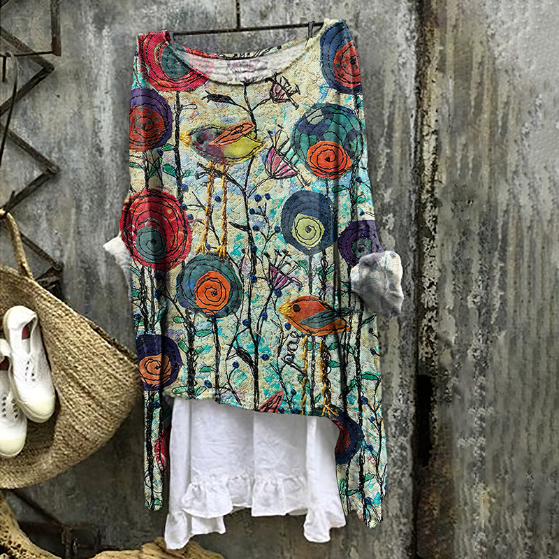 Women's Vintage Bird And Flower Art Linen T-shirt