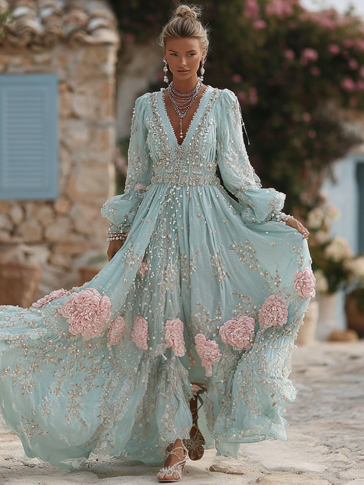 Women's Vintage Bohemian Floral Embroidered Casual Long Sleeve Dress