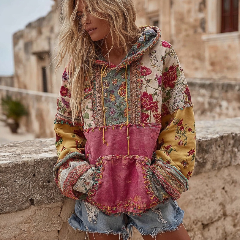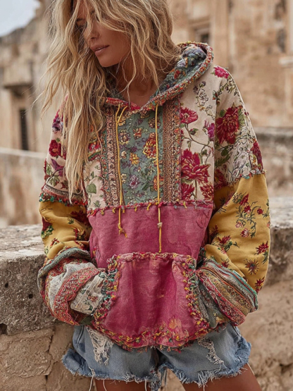 Women's Vintage Bohemian Floral Embroidery Patchwork Art Casual Hoodie