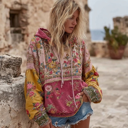 Women's Vintage Bohemian Floral Embroidery Patchwork Art Casual Long Sleeve Hoodie