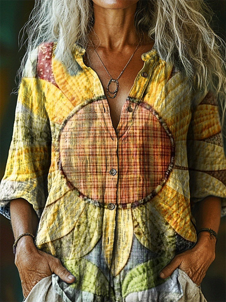 Women's Vintage Bohemian Sunfloral Patchwork Art Print Casual Cotton Linen Shirt
