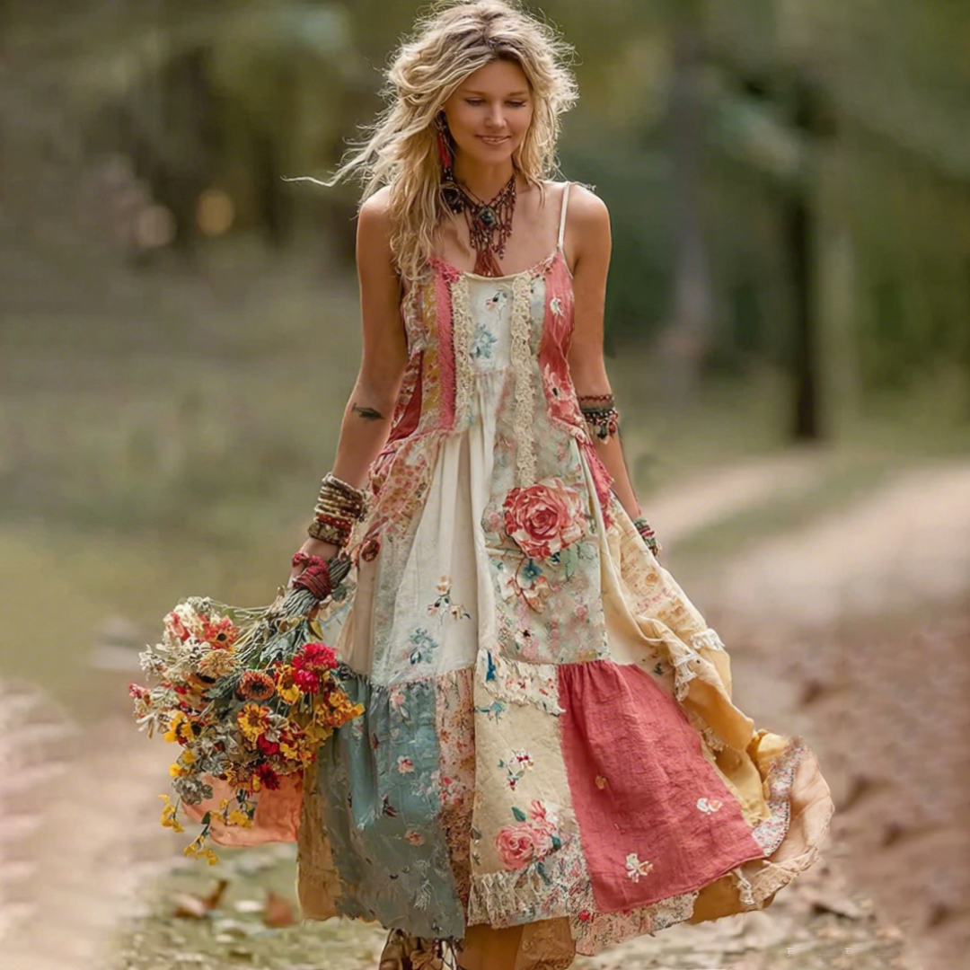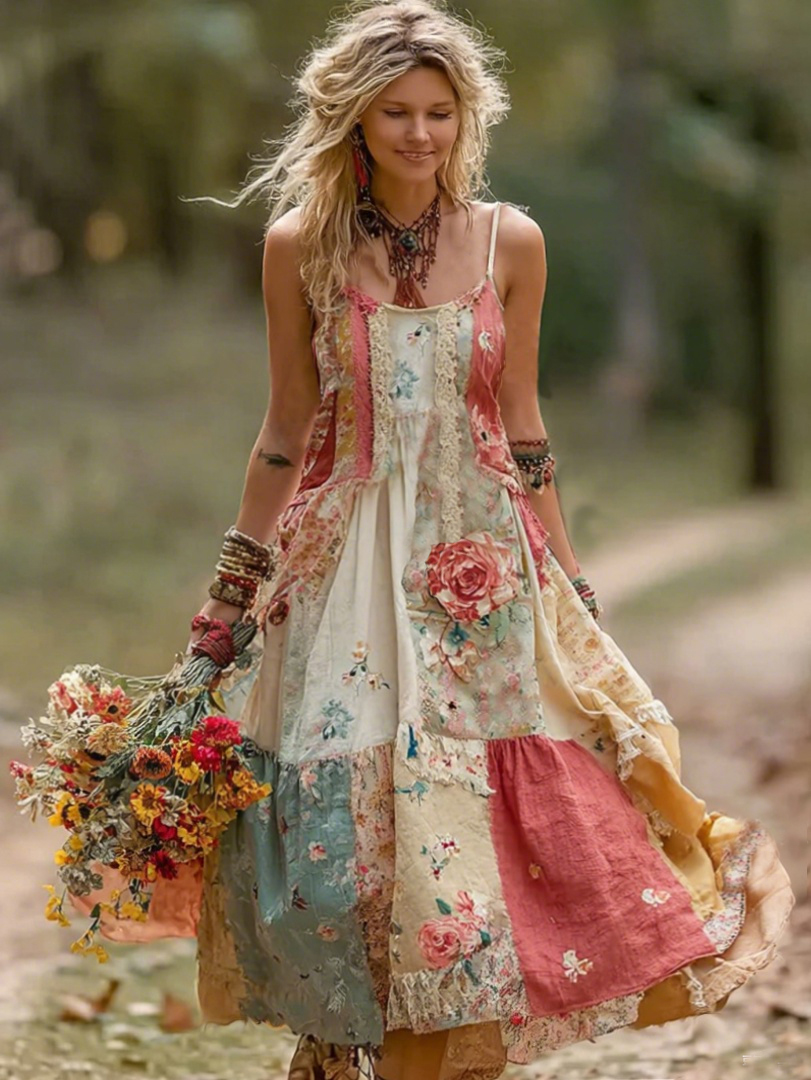 Women's Vintage Boho Floral Art Patchwork Comfy Midi Dress