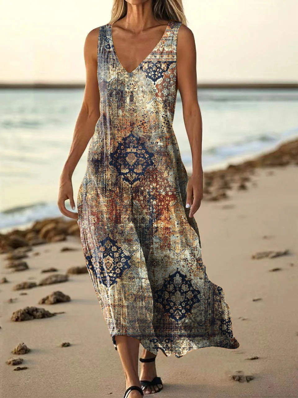 Women's Vintage Ethnic Floral Art Print Pocket Cotton Dress