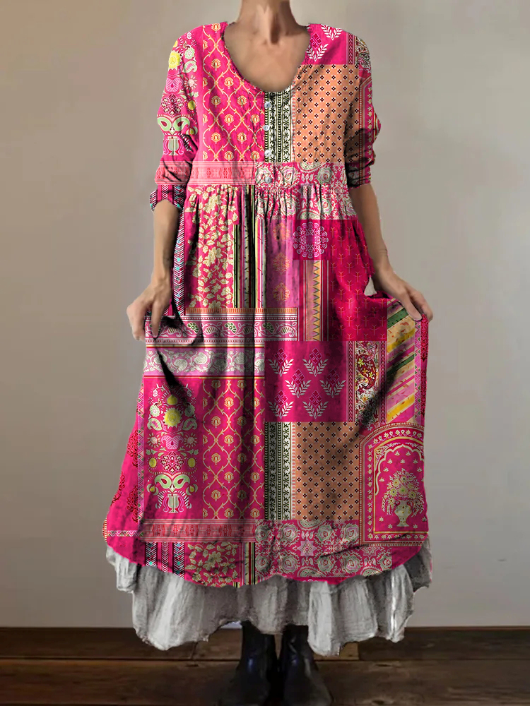 Women's Vintage Ethnic Floral Art Print V-Neck Button Pocket Cotton Dress