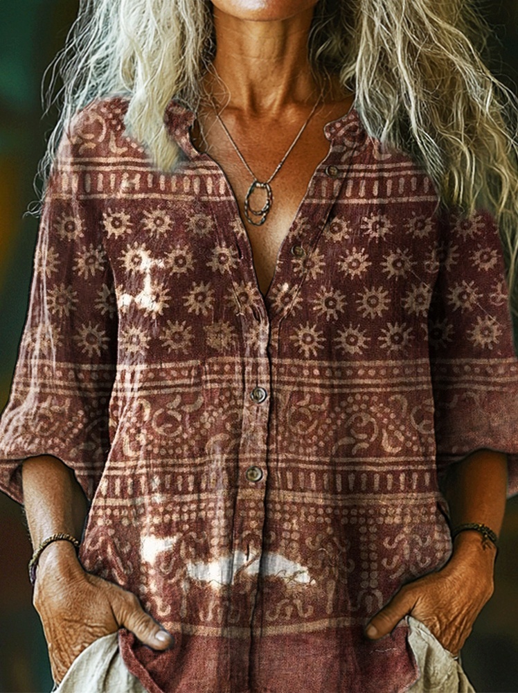 Women's Vintage Ethnic Floral Collage Art Print Casual Cotton Linen Shirt