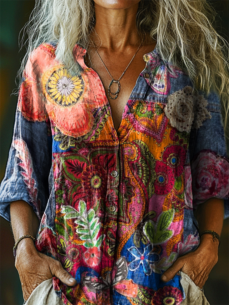 Women's Vintage Ethnic Floral Patchwork Art Print Casual Cotton Linen Shirt