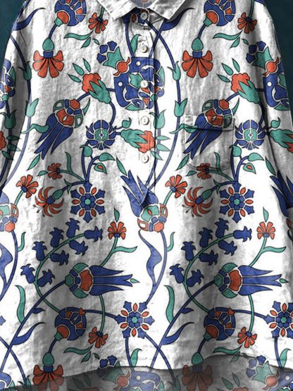 Women's Vintage Floral Art Print Casual Cotton And Linen Shirt