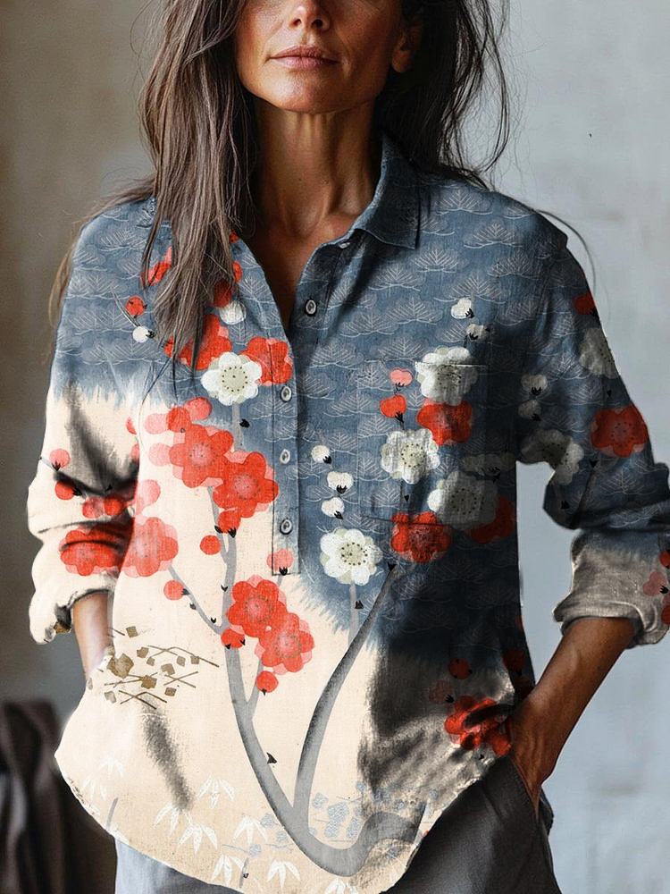 Women's Vintage Floral Art Print Casual Cotton and Linen Shirt