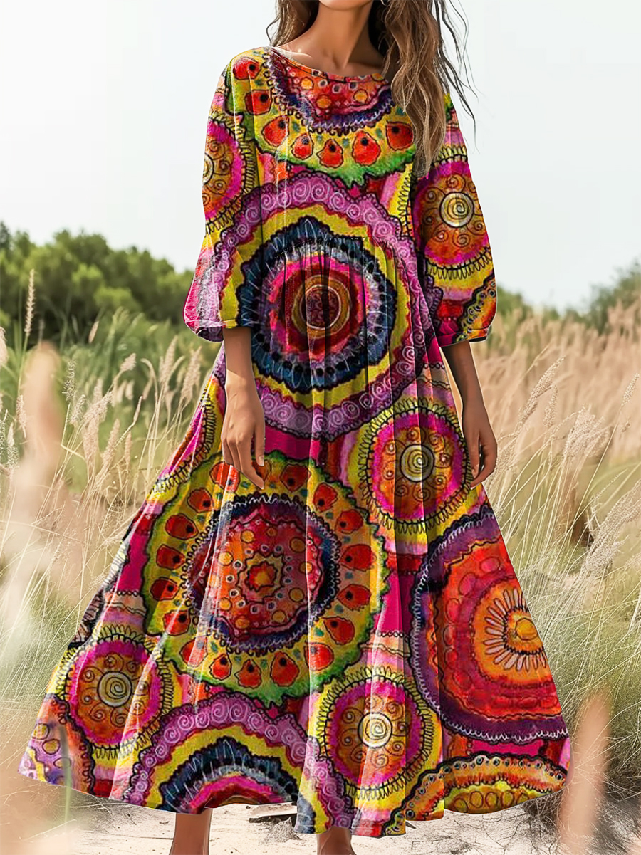Women's Vintage Floral Art Print Flowy Cotton Crew Neck Dress