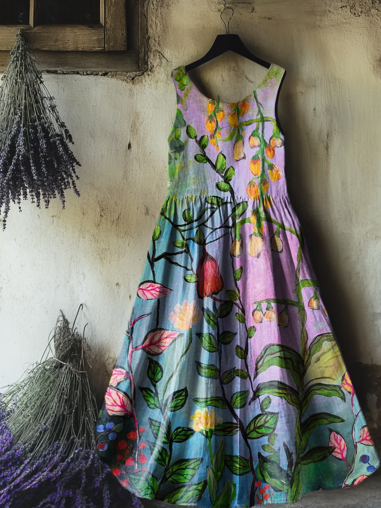 Women's Vintage Floral Art Print Sleeveless Cotton Pocket Dress