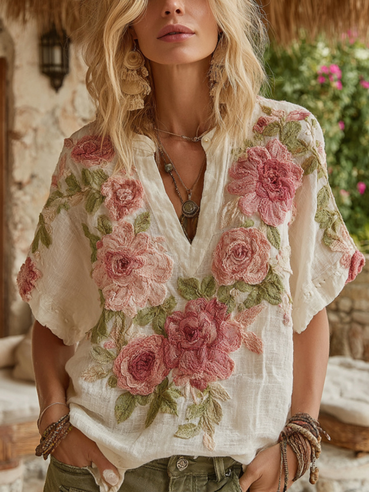 Women's Vintage Floral Art V Neck Linen Short Sleeve T-shirt