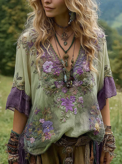 Women's Vintage Floral Embroidery Art V Neck Linen T-shirt