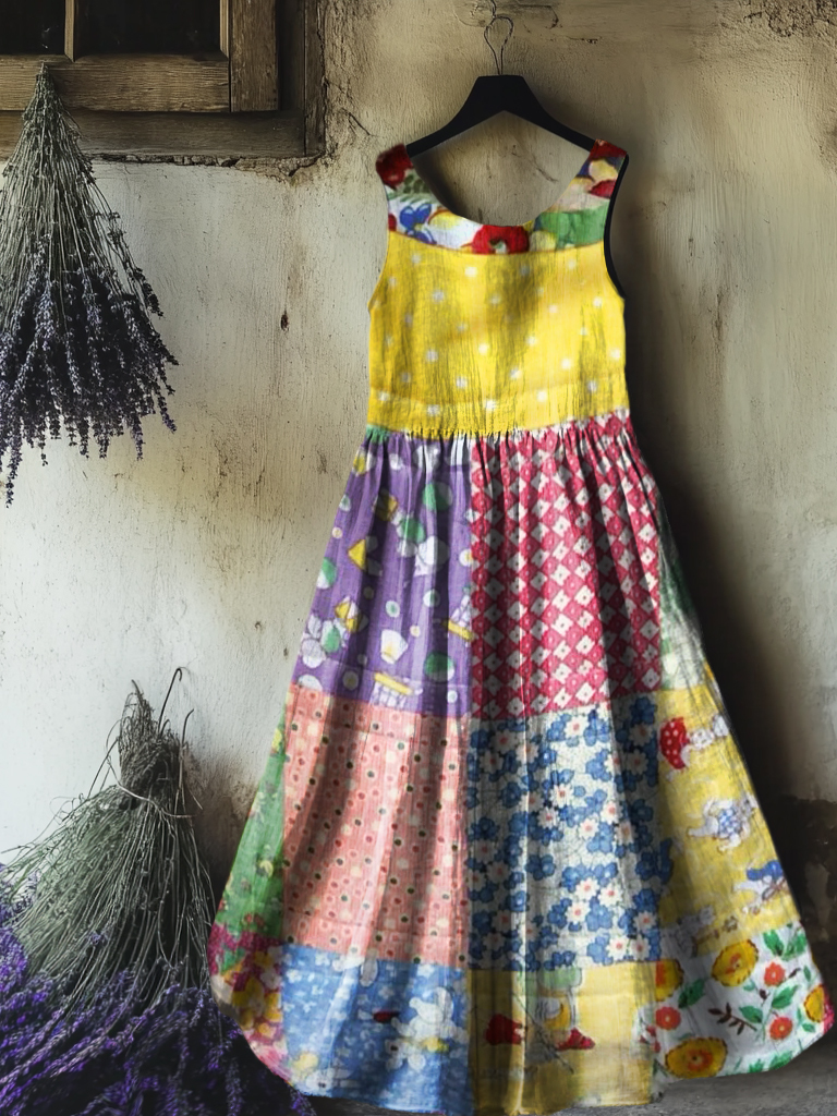 Women's Vintage Floral Patchwork Art Print Crew Neck Sleeveless Cotton Pocket Dress