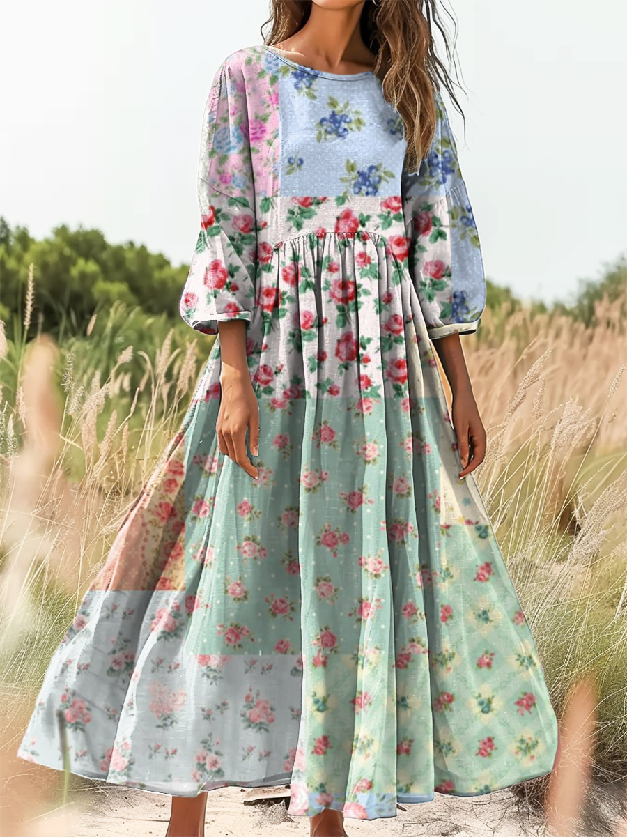 Women's Vintage Floral Patchwork Art Print Flowy Cotton Crew Neck Dress