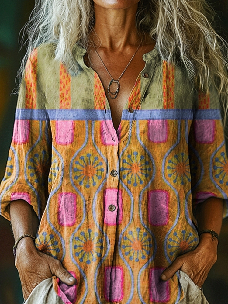 Women's Vintage Floral Tattoo Pattern Art Print Linen Cotton Casual Shirt