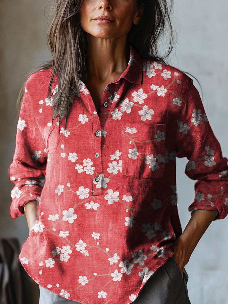 Women's Vintage Japanese Classic Plum Blossom Art Print Casual Cotton And Linen Shirt
