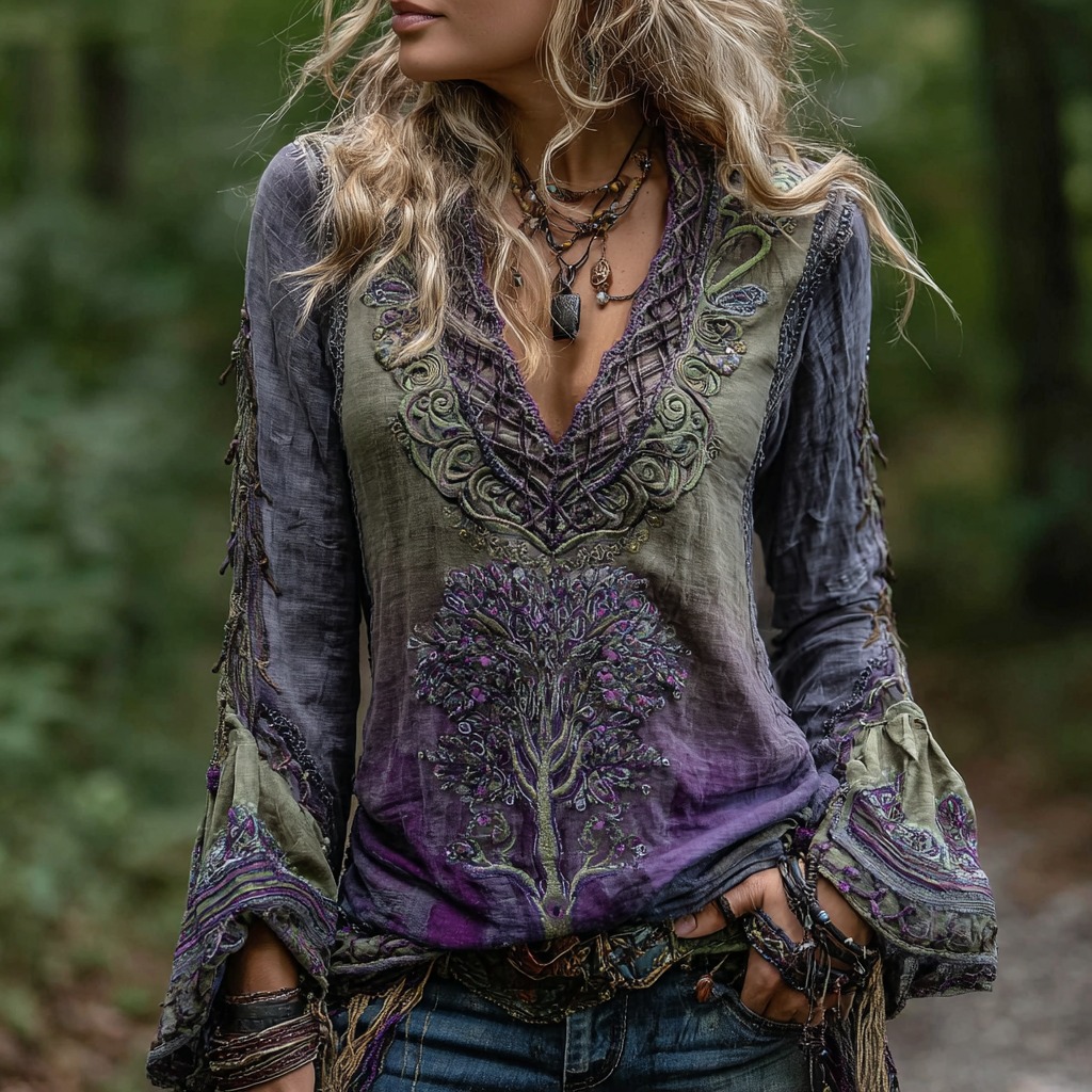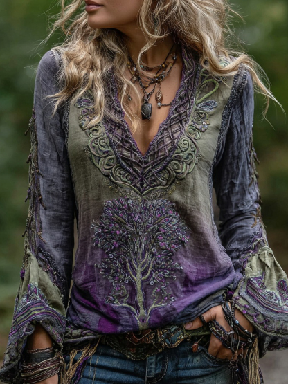 Women's Vintage Life Of Tree Celtic Knot Art Pattern Linen Shirt
