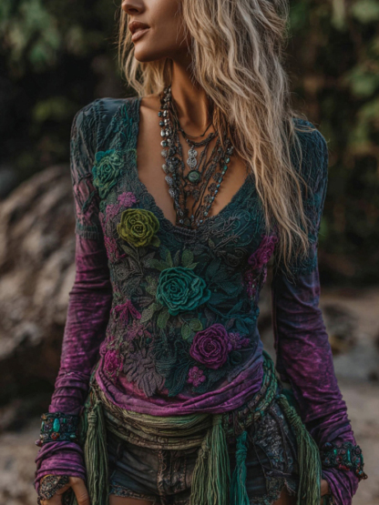 Women's Vintage Rose Gradient Art V Neck T-shirt