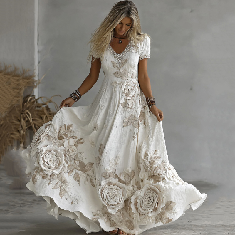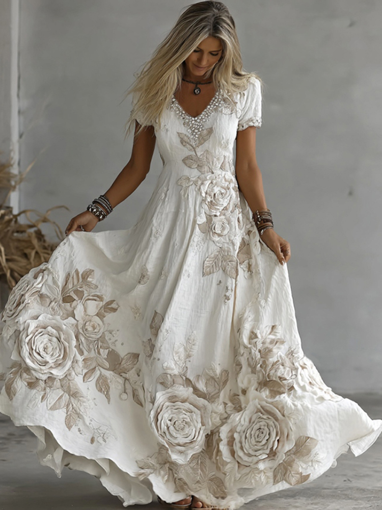 Women's White Rose Embroidery Art V-neck Short Sleeve Maxi Dress