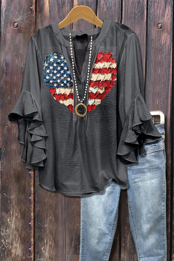 America Heart Print Ruffle Sleeve Patriotic Top